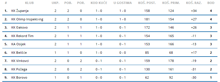 - Utakmica br. 9: KK Požega – KK Županja 50:75 (14:15, 7:16, 12:22, 17:22)