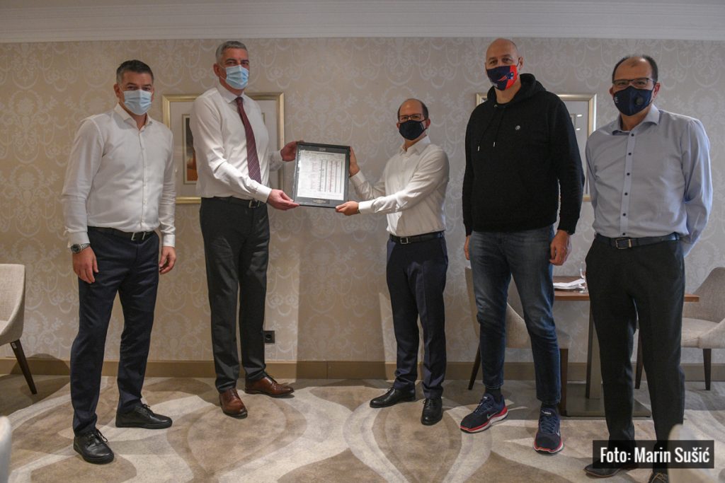 S čelnicima Hrvatskog košarkaškog saveza predstavnici FIBA-e su se sreli odmah ujutro na radnom sastanku prilikom kojeg su predsjedniku HKS-a Stojku Vrankoviću, predsjedniku Stručnog savjeta Dini Rađi i glavnom tajniku Josipu Vrankoviću uručili uokvireni zapisnik s utakmice na kojoj je Hrvatska osvojila brončanu medalju na Svjetskom prvenstvu 1994. u Torontu. Za Hrvatsku su tada igrali: Josip Vranković, Alan Gregov, Arijan Komazec, Toni Kukoč, Vladan Alanović, Ivica Žurić, Davor Pejčinović, Stojko Vranković, Danko Cvjetićanin, Miro Jurić, Dino Rađa i Veljko Mršić (izbornik je bio Giuseppe Giergia), odnosno svih trojica predstavnika Saveza prisutnih na sastanku.
