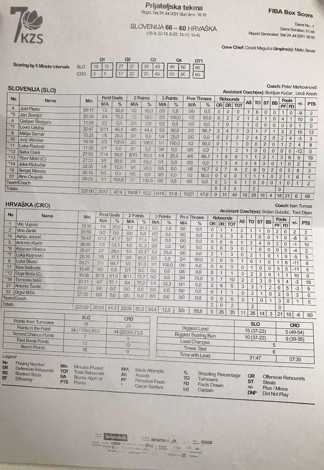 Najbolji u hrvatskim redovima bio je kapetan Duje Brala s double-double učinkom (19 poena, 10 skokova). Tomislav Ivišić je uz 9 poena imao 10 skokova, a Andrija Jelavić je na 10 poena dodao 6 skokova i 4 osvojene lopte. Kod Slovenaca su se istaknuli Saša Ciani s 19 i 6 skokova Lovro Urbiha s 13 poena i po 7 skokova i osvojenih lopti.