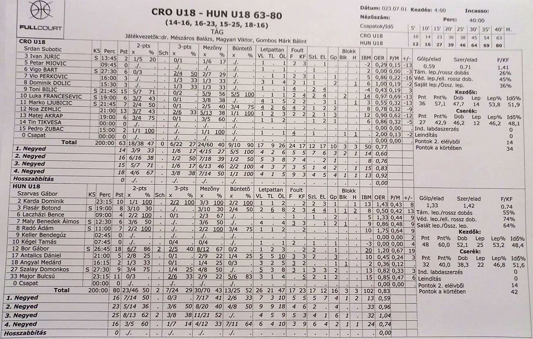 Toni Bilić s 15 i Noa Zemljić s 13 poena bili su jedini igrač s dvoznamenkastim brojem poena u hrvatskoj reprezentaciji. Kod Mađara je prednjačio Gabor Bor s 18 poena.